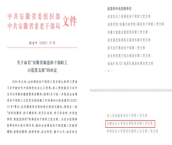 茶业学院退休教工党支部坚持以政治建设为引领,通过打造“银发生辉”“青蓝工程”等党建品牌,不断强化党员政治理论学习,激活党员银发引擎,释放“银发动能”,扎实推进党支部标准化规范化建设,发挥党员模范作用,助力学校“双一流”建设,赋能乡村全面振兴,取得了良好成效。