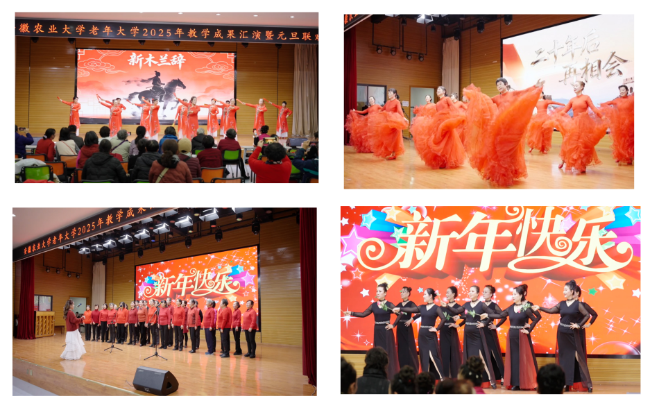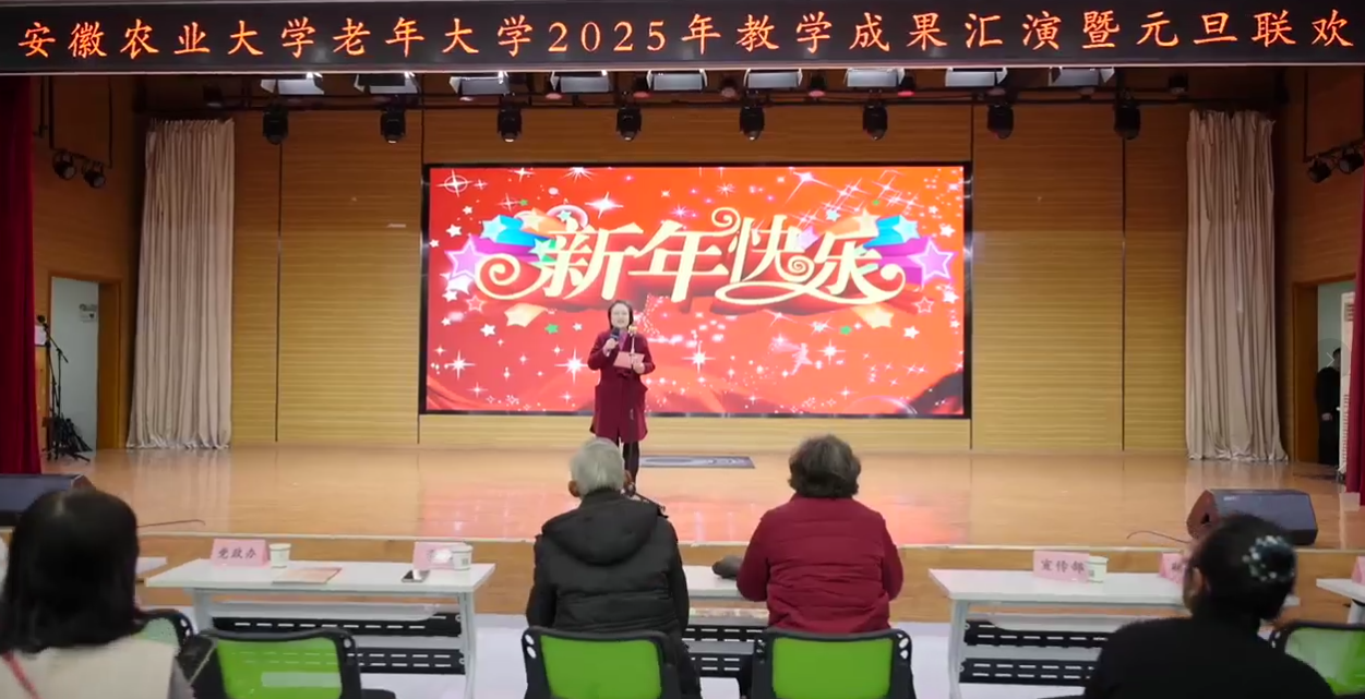 本网讯 岁聿云暮,新元肇启。2025年12月31日,安徽农业大学老年大学教学成果汇演暨元旦联欢会在欣苑小礼堂隆重举行。校党委常委、副校长李红出席活动并致辞,校关工委副主任、原校党委副书记王华丽,校老科协会长、原校纪委书记刘长安,校直部门负责人、老年大学全体师生学员欢聚一堂,共同联欢。